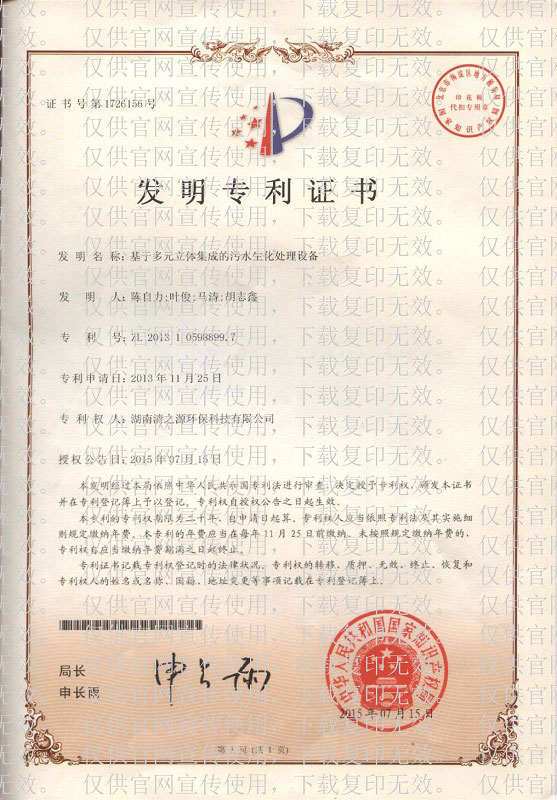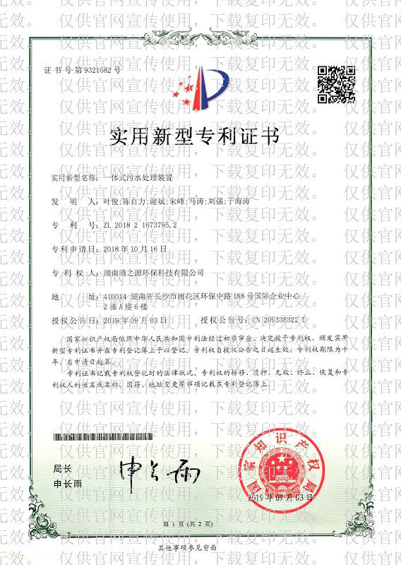 實(shí)用新型專利證書 一體式MBR污水處理裝置