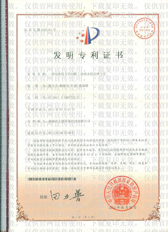 發(fā)明專利證書 一體化無水處理設(shè)備及方法