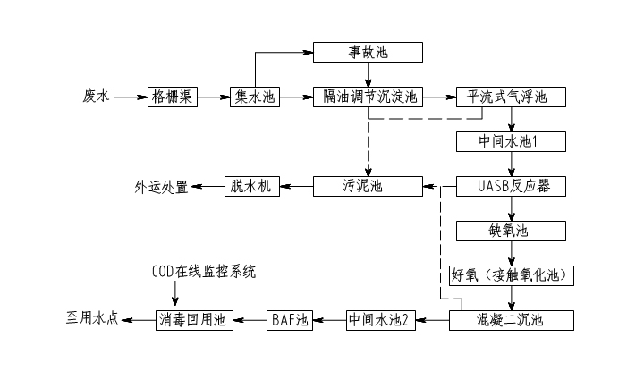 經(jīng)過嚴格工藝比選,我司選用“氣浮+UASB+AAO+BAF”的主題工藝,其中好氧段選用接觸氧化工藝。工藝路線如下: